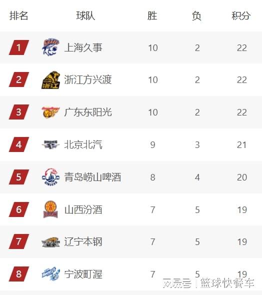 积分榜第四名则属于北京队,作为本赛季第一争冠热门球队,北京队最近状态一般,本轮比赛他们在主场迎战山东队,双方苦战四节后,北京队未能顶住压力,惨遭山东队压哨绝杀,最终以2分之差惜败,遭遇本赛季第3败,这一场失利后,北京队的战绩变成9胜3负,暂居积分榜第4名。而积分榜第五名则属于青岛队,他们目前的战绩是8胜4负,最近的糟糕状态,让他们与北上广逐渐拉开差距。