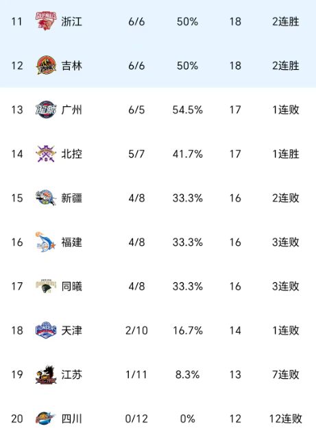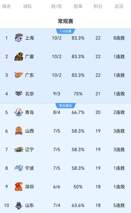 随着山东压哨绝杀北京,广厦大胜,辽宁3连胜,CBA最新积分榜如下
