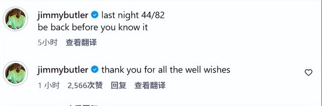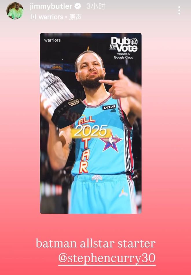 巴特勒还在社媒评论区回应大家:“感谢大家的所有祝福。”另外,在IG的快拍中,他也不忘晒照祝贺库里入选全明星首发,他配文写道:“蝙蝠侠,全明星首发@库里。”