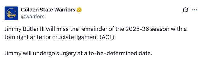 北京时间1月21日,勇士官方发布声明,前锋吉米-巴特勒因右膝前交叉韧带撕裂,将缺席2025-26赛季的剩余所有比赛。巴特勒是在昨日对阵迈阿密热火的比赛第三节还剩7分41秒时受伤的,勇士队最终以135-112获胜。他将在择期接受手术。