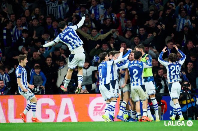 第32分钟,本场比赛真正的第一个进球产生,久保建英在右路策动进攻,格德斯45度传中,奥亚萨瓦尔后点不停球一脚爆射,打破僵局。