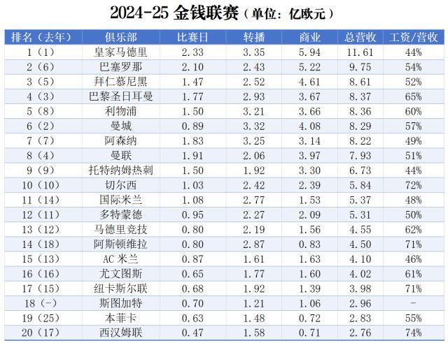 1月21日,德勤会计师事务所发布2024-25赛季金钱联赛报告,收录了上赛季世界足坛营收金额前20名俱乐部(以下简称“二十强”)的财政数据。