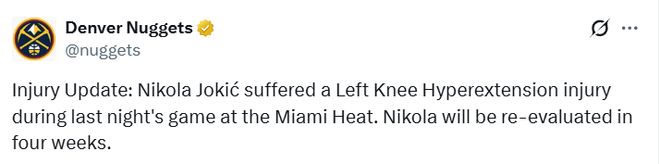 约基奇在周二对阵热火的比赛中膝盖受伤。塞尔维亚记者乔尔杰-马蒂奇报道称,这位大个子球员出现膝盖过度伸展症状,但并未遭遇更严重的伤病。球队今日的更新公告证实了这一消息。