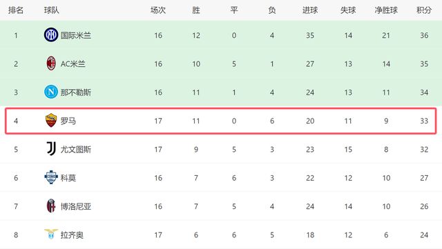 意甲2025年度积分榜:罗马37场26胜82分居首,国米次席